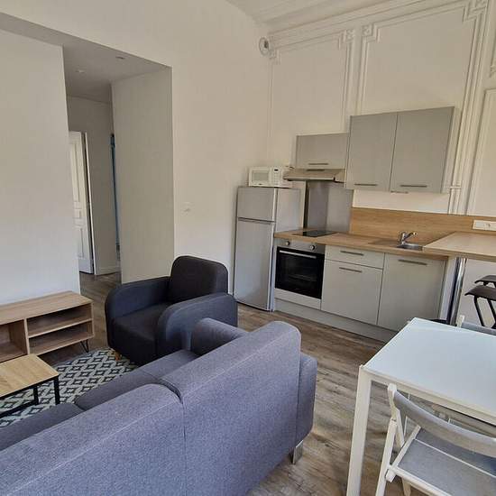 Dans un immeuble sécurisé, cet appartement entièrement rénové avec mise à dispositions des meubles comprend une entrée avec rangements, un séjour avec balcon ouvert sur une cuisine aménagée et équipée, deux chambres avec bureau et avec lit en mezzanine ainsi qu'une salle de douche avec lave linge et un W.C séparé. Profitez des commodités de l'hyper centre. Loyer: 850 euros Charges: 39 euros Caution 850 euros Honoraires: 383.46 euros. Disponible dès maintenant.