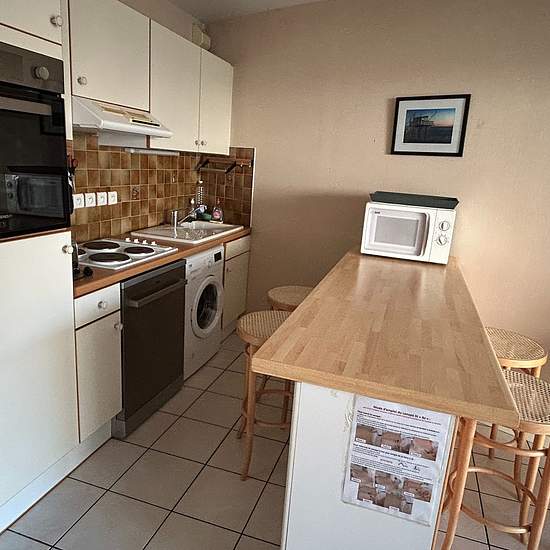 Bel appartement 54m² (2 étoiles) au 1er étage, 50m plage, tous commerces, bien situé, 2 chambres, 4 personnes, avec terrasse vue jardin-jsalon de jardin, entrée rés. sécurisée. Pas d'animaux Séjour/coin cuisine avec TV, frigo, évier, lave-linge, lave-vaisselle, four, 4 plaques électrique, micro-ondes, grille-pain, cafetière, vaisselle fournie. 1 chambre avec lit 140 1 chambre avec 2 lits superposés Salle-de-bains, WC. Entrée(placard: table et fer à repasser, aspirateur, balais) parking dans la rue. Surfaces et distances données à titre infor...