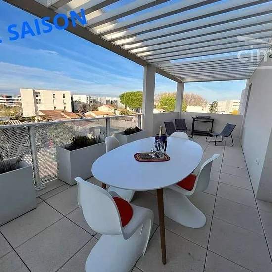 Location saisonnière : Venez séjourner dans ce charmant T3 situé à Sérignan en résidence sécurisée avec ascenseur et parking privé. Idéal pour 4 personnes, le bien est composé comme suit: un séjour/cuisine entièrement équipée, 2 chambres avec lits doubles (un 160 et un 180), une salle d'eau, un WC séparé et une belle terrasse de 24m² avec plancha électrique. Le ménage et le linge de maison sont inclus (possibilité de louer les kits de serviettes à l'agence). Le logement dispose du wifi et les animaux sont acceptés. Equipements: - clim - four...