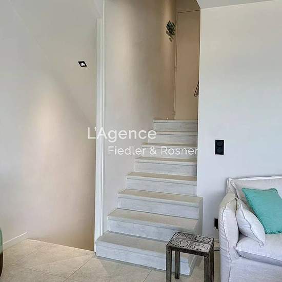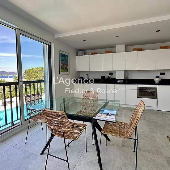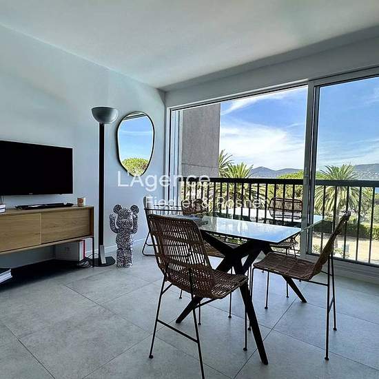 Appartement de 64 m2 - 2 chambres - 2 salles de douche - piscine en copropriété. Appartement cosy et lumineux bénéficiant d'une très jolie vue mer, situé dans une résidence avec gardien et à 5 minutes seulement de la Place des Lices. Accès aux places de parking sans place attitrée. Exposition Nord. 4 convives maximum. L'appartement se compose comme suit : au premier niveau, entrée avec toilettes invités et coin buanderie avec lave-linge séchant. Sur un niveau, le salon/ salle à manger avec cuisine (réfrigérateur, plaque de cuisson, hotte, mi...