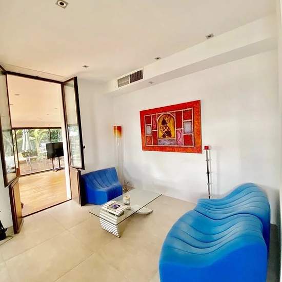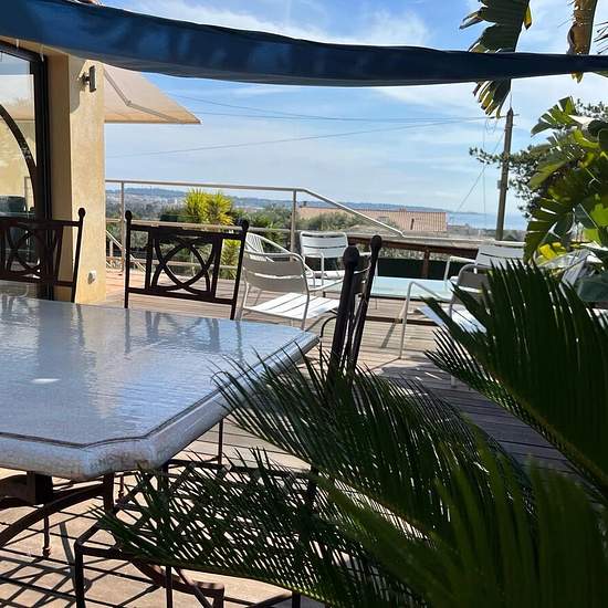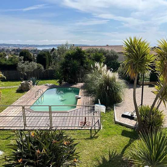 GOLFE JUAN – LOCATION A PARTIR DE FEVRIER 2025 - Au calme, proche du centre-ville, vue mer. Haut de villa à louer de 120 m2, avec accès privé à la piscine et au jardin de 1 800 m2. Le bas de la villa en rez de jardin est inoccupé et sert de stockage. Cet appartement comprend 2 salles de bains, 2 chambres, une cuisine ouverte, un séjour, une salle à manger et une belle terrasse avec lounge et coin dinatoire vue mer. Le tarif inclut l'entretien du jardin et de la piscine.