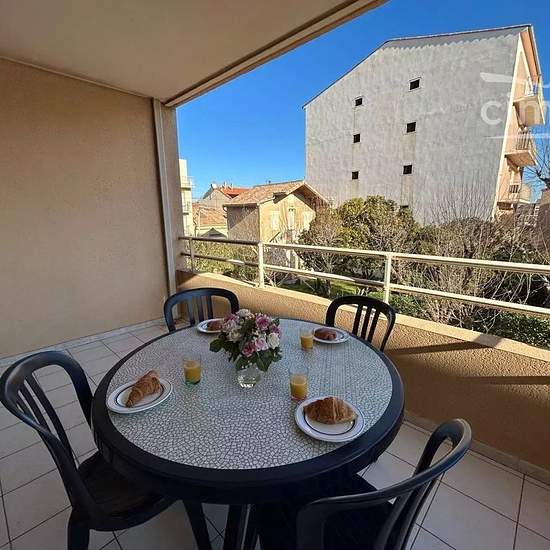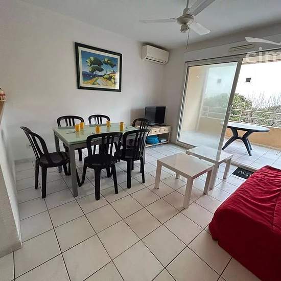 LOCATION SAISONNIERE Venez passer votre séjour dans ce joli T3 climatisé situé au 1er étage d'une résidence avec place de parking privée, à 50m de la plage. Idéal pour 6 personnes, le logement est composé comme suit : un séjour/cuisine entièrement équipée (cafetière filtre et Tassimo) avec canapé convertible (140) donnant accès à une terrasse avec barbecue et vue mer, deux chambres avec lits 140 et rangements, une salle de bain et un WC indépendant. Cet appartement dispose du wifi. Les animaux ne sont pas acceptés. Le ménage et les draps son...