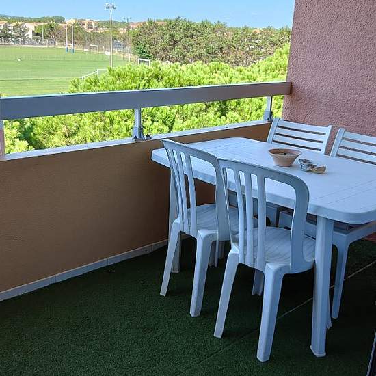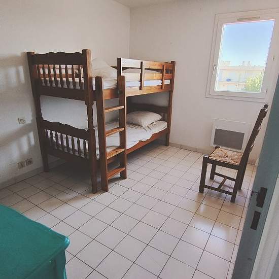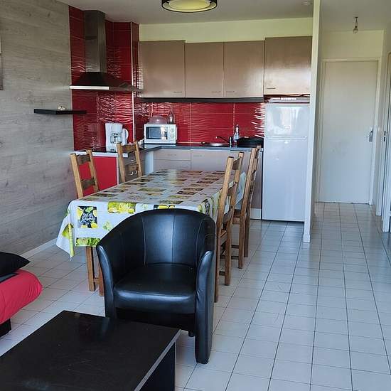 LOCATION A L'ANNÉE MEUBLÉE En résidence sécurisée , au 3ème et dernier étage, un bel appartement meublé, loué à l'année donnant sur une jolie terrasse composé d'un séjour spacieux avec cuisine équipée , deux chambres avec lits 140 et lits superposées un wc séparé , une salle de bains . Très bon état . Equipements :plaques electriques, micro-ondes, réfrigérateur/congélateur Libre 566€ + 30€ de charges ( charges comprennent l'eau et la copropriété avec régularisation annuelle) résidence en face du stade , très bien située , vue dégagée. - hono...