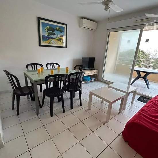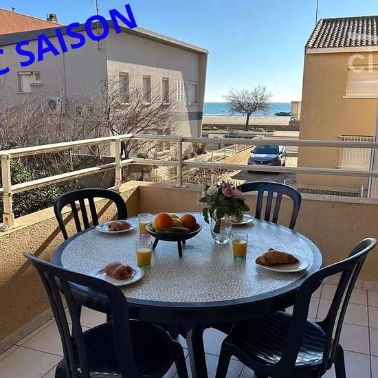 LOCATION SAISONNIERE Venez passer votre séjour dans ce joli T3 climatisé situé au 1er étage d'une résidence avec place de parking privée, à 50m de la plage. Idéal pour 6 personnes, le logement est composé comme suit : un séjour/cuisine entièrement équipée (cafetière filtre et Tassimo) avec canapé convertible (140) donnant accès à une terrasse avec barbecue et vue mer, deux chambres avec lits 140 et rangements, une salle de bain et un WC indépendant. Cet appartement dispose du wifi. Les animaux ne sont pas acceptés. Le ménage et les draps son...