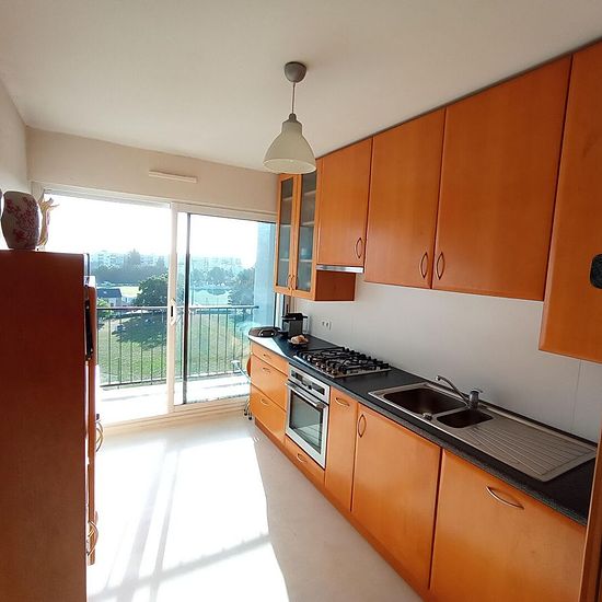 Bel appartement rénové avec goût, 8eme étage d'une résidence sécurisée avec ascenseur dans le quartier des hauts de Kérizac, comprenant entrée, cellier avec arrivée/évacuation lave linge, cuisine entièrement équipée et aménagée donnant sur balcon, double séjour donnant sur balcon, salle de bains avec placards, wc avec placards et 2 chambres dont une avec placard. Volets roulants électriques et chaudière gaz. Une cave et un parking en sous-sol. Loyer : 850Euro Provisions sur charges : 45 Euro par mois LIBRE DE SUITE Honoraires charge locatair...