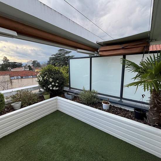 VIENNE, Dans le secteur prisé de la Pyramide, à 5 minutes à pieds du centre ville, dans une Résidence de Standing récente, sécurisée et verdoyante avec ascenseur, venez découvrir cet appartement de type 3 de 69.03 m² au dernier étage exposé PLEIN SUD avec très belle terrasse arborée privative (store banne électrique) et comprenant : Hall d'entrée, salon/ séjour donnant accès à la terrasse, cuisine meublée et équipée (hotte, plaque de cuisson, four, éléments de rangements hauts et bas) donnant accès à la terrasse, deux chambres avec parquet e...