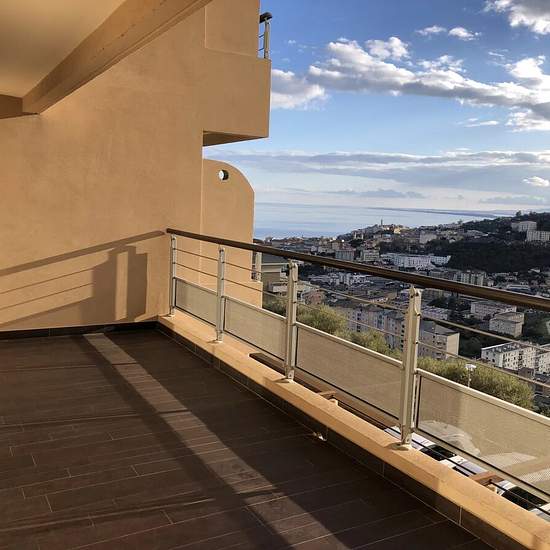Beau T3 en duplex situé dans la résidence LES TERRASSES DU BELVÉDÈRE, au 1er étage, sur les hauteurs de Bastia. Il est composé d'un séjour ouvert sur une grande cuisine équipée, ainsi qu'un WC indépendant au 1er niveau, puis de 2 chambres avec rangements, dressing et salle de bain au second niveau. Il dispose d'une terrasse de 17 m² et d'un balcon. Climatisation, ascenseur, parking sécurisé, avec 1 place de stationnement attribuée. Disponible le 19/01/2026.