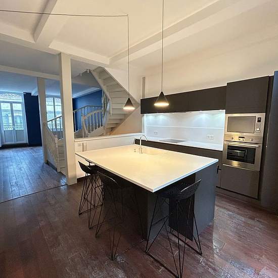 Au coeur du centre-ville commerçant, rue Montesquieu, location de cette charmante maison T6. En rez-de-chaussée, l'entrée vous permet d'accéder à une grande buanderie de 14m2 et au magnifique escalier qui vous conduira aux autres pièces de la maison. Au premier étage, découvrez une lumineuse pièce de vie communiquant avec une cuisine entièrement équipée (plaque, four, hotte, réfrigérateur, lave-vaisselle) pour une surface totale de 38m2, et bénéficiant d'un accès direct à une terrasse sans vis-à-vis. Au deuxième, un séjour avec une cheminée ...
