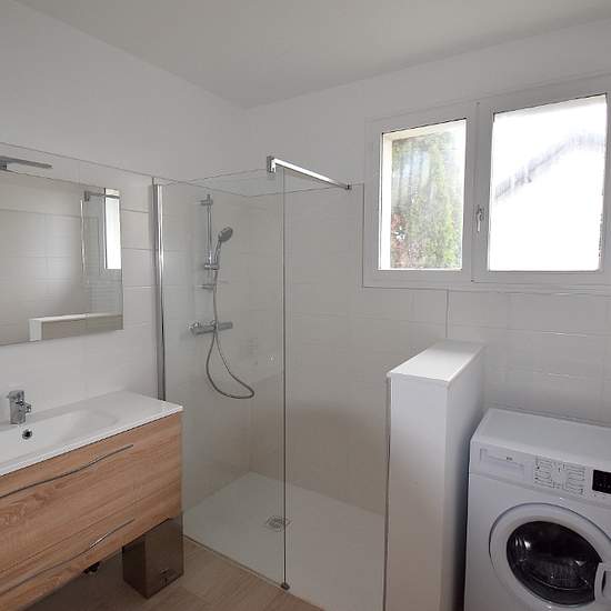 Loue maison 3 pièces meublée sur sous-sol surélevé. Entrée avec placards, pièce de vie de 31m² avec cuisine aménagée et équipée (lave vaisselle, machine à laver, plaque, four, hotte, frigo) petit balcon. Dégagement avec placard desservant les 2 chambres, la salle d'eau et les WC. Sous-sol bétonné sur la totalité de la maison avec porte de garage. Terrain arboré et clos. Chauffage et production eau chaude électrique. Fenêtre en double vitrage et volets motorisés. Disponible de suite.