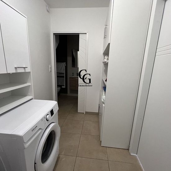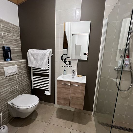 Bourg de Château Thébaud - Maison T3 meublée de 86m² - Elle se compose d'une entrée avec placard, d'un coin buanderie avec machine à laver, d'une salle d'eau avec WC, d'une pièce donnant sur cour. A l'étage : une pièce principale avec cuisine aménagée et équipée (four, plaques de cuisson, hotte, réfrigérateur et lave-vaisselle), deux chambres avec placards, une salle d'eau et un WC. Cour et Garage. Clim réversible. Libre le 01/04/2026. Loyer : 850.00 ? + 40.00 ? de provision pour charges (entretien de la pompe de relavage et de la clim) Hono...