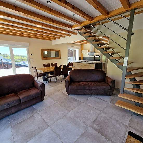 Libre fin février - VISITE SUR DOSSIER Situé sur le site de Menthières, une maison individuelle T3 en duplex de 91.34m2 comprenant salon/séjour avec canapés, meuble TV, table et chaises. Cuisine équipée, une salle d'eau avec douche avec lave-linge et sèche-linge, WC. A l'étage 2 chambres avec lits et meubles, salle d'eau avec douche, WC. 1 Garage, la porte blanche de droite. Terrain. Terrasse. Chauffage Gaz citerne à la charge des locataires. A la charge du locataire le chauffage au sol et eau chaude au GAZ. L'Eau froide. La taxe des ordures...