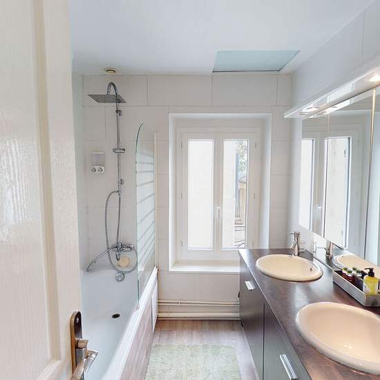 Jolie maison de ville meublée et rénovée avec goût. Située dans une petite ruelle au calme, elle comprend : Au rez-de-chaussée : un salon/salle à manger, une cuisine entièrement équipée (vaisselle, ustensiles, micro-ondes, four, lave-vaisselle, réfrigérateur, grille-pain, cafetière, bouilloire), une buanderie avec lave-linge et étendoir à linge, ainsi qu'un WC séparé. A l'étage : un palier desservant deux chambres avec rangements et bureau, ainsi qu'une salle de bains/WC.