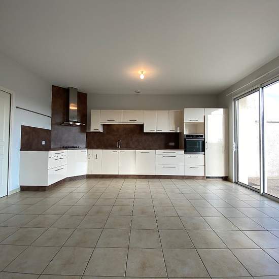 REF 5180 GENNES, PAVILLON Mitoyen, Classé BBC T5 mitoyen en Duplex, 122 m², 3 chambres, 2 SDB, séjour avec cuisine ouverte équipée (plaques, frigo, hotte, four et lave-vaisselle laissé à titre gracieux), terrasse + terrain clos d'environ 300 m², cellier, buanderie, Chauffage ind/sol géothermie, garage avec espace de rangement par escaliers escamotables au dessus de celui-ci, 1 parking réservé, LIBRE