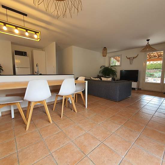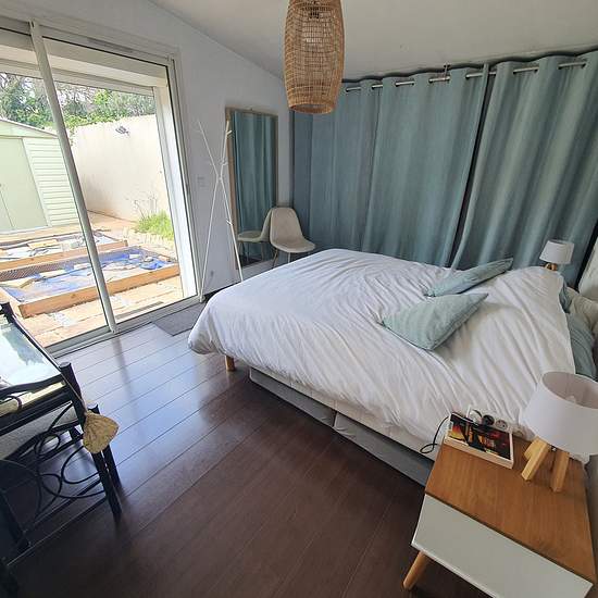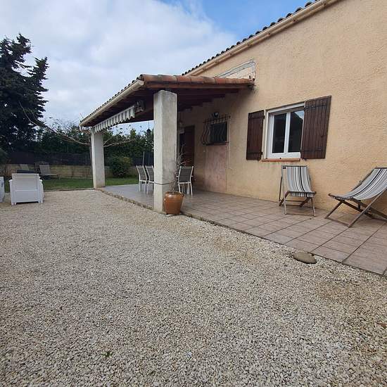 Maison de plain pieds type 4 d'environ 82 m2, sur parcelle de terrain clôturé. La maison est mitoyenne d'un côté et composée de - un séjour salon avec cuisine aménagée ouverte donnant sur terrasse une chambre un dressing buanderie. Dégagement nuit desservant, deux chambres dont une avec placard, un wc séparé, une salle de bains. Chauffage électrique et climatisation réversible. Double vitrage. La maison est au calme. Jardin arboré deux terrasses, un abri jardin. La taxe d'ordures ménagères 229.00 EUR réf 2025 entretien climatisation 195.00 E...