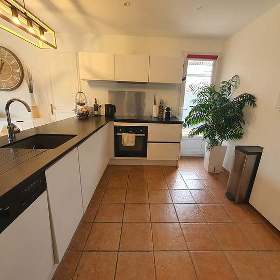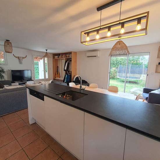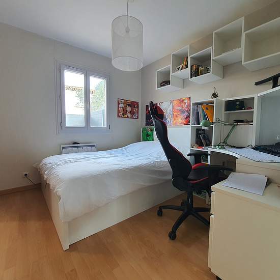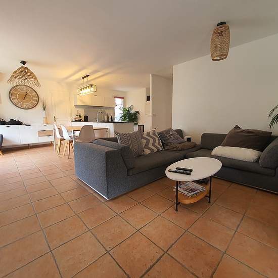 Maison de plain pieds type 4 d'environ 82 m2, sur parcelle de terrain clôturé. La maison est mitoyenne d'un côté et composée de - un séjour salon avec cuisine aménagée ouverte donnant sur terrasse une chambre un dressing buanderie. Dégagement nuit desservant, deux chambres dont une avec placard, un wc séparé, une salle de bains. Chauffage électrique et climatisation réversible. Double vitrage. La maison est au calme. Jardin arboré deux terrasses, un abri jardin. La taxe d'ordures ménagères 229.00 EUR réf 2025 entretien climatisation 195.00 E...