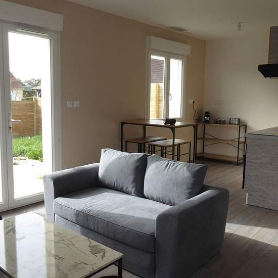 Maison meublée à louer. Mer, maison neuve meublée, séjour avec coin cuisine aménagée et équipée, salle d'eau, deux chambres avec placards. Place de stationnement, jardin et avec terrasse Tout est compris dans les charges. Disponible de suite.