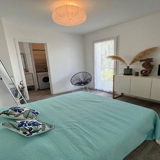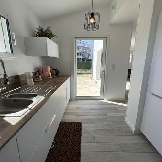 A seulement 450m du Marché Central et 1100m de la plage, belle maison récente de type 3 comprenant : - Au rez-de-chaussée : Entrée avec placard, séjour-salon ouvrant sur terrasse et jardin, cuisine ouverte et aménagée, une chambre avec salle d'eau et wc, un second wc. - A l'étage : Palier avec coin bureau, une chambre avec dressing, salle de bains avec wc. Garage - Chauffage au sol par une pompe à chaleur.