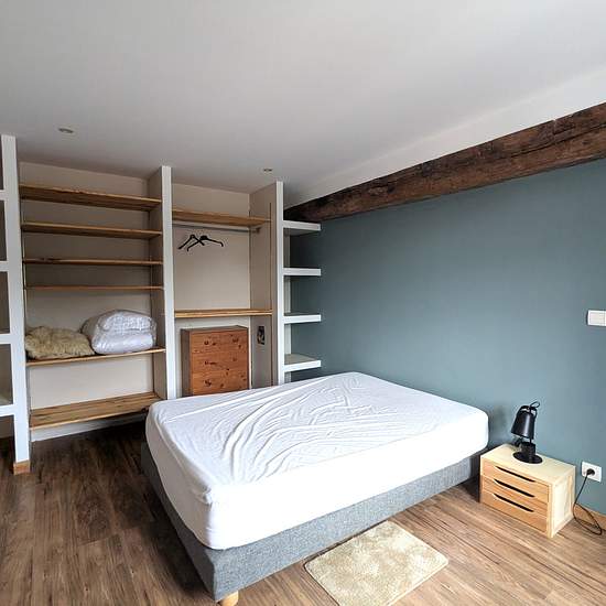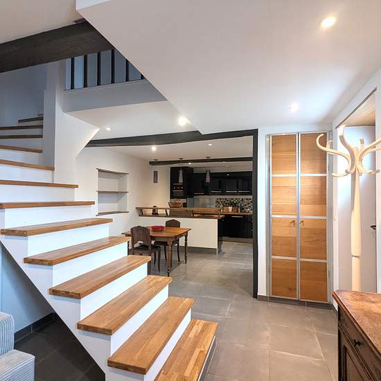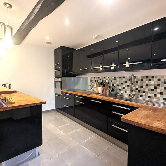 La maison est située dans le bourg de Sauveterre. Elle bénéficie d'un emplacement accessible avec un espace de stationnement comprenant un garage et une cour. À l'arrière, elle dispose d'un jardin agrémenté d'une terrasse couverte. L'entrée se fait directement dans la pièce de vie, qui comprend un coin séjour avec canapé. La cuisine est ouverte sur la pièce principale, séparée par un comptoir, et équipée d'une plaque de cuisson, d'une hotte, d'un four, d'un micro-ondes, d'un lave-vaisselle et d'un réfrigérateur. Un placard est présent à prox...