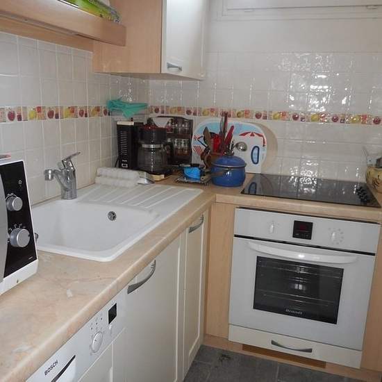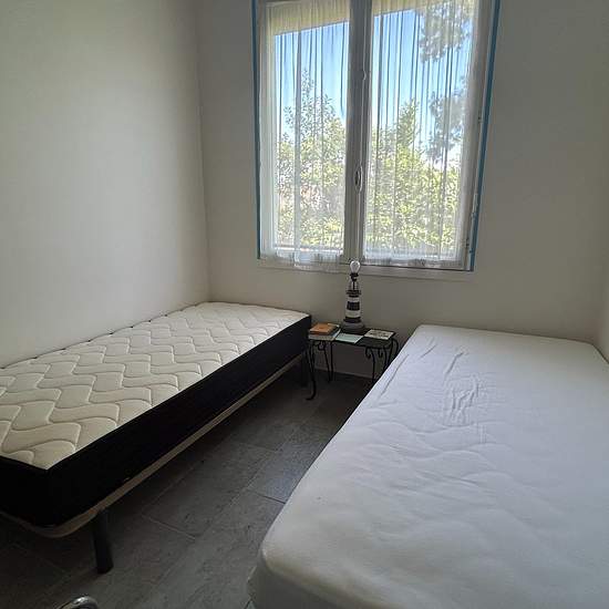 Maison en rez-de-chaussée mitoyenne à l'arrière, grand jardin clos, terrasse, parking partagé à l'avant du terrain. Séjour (TV), cuisine rénovée (lave-vaisselle, micro-ondes, four, 4 plaques), 2 chambres lits de 140, salle-d'eau rénovée/douche italienne, WC séparé. Cellier (lave-linge, réfrigérateur-freezer) 550m plage du bureau et centre Surfaces et distances données à titre informatif et non contractuel. Ces prix s'entendent consommations incluses en saison. Taxe de séjour en plus. Nous acceptons les chèques-vacances Juin et septembre: 438...