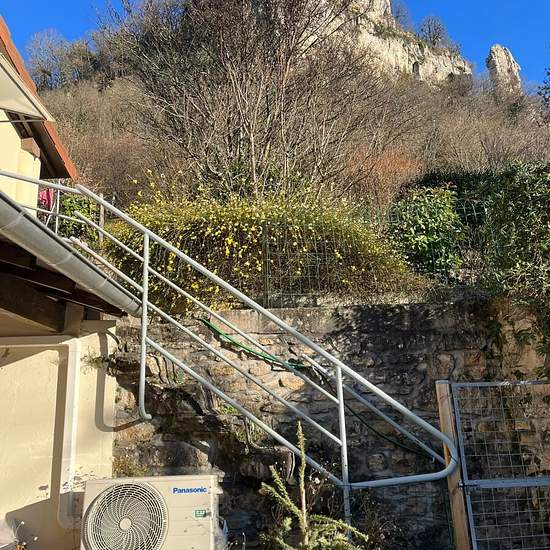 A LOUER, au coeur du village de Saint-Sorlin-en-Bugey: maison de village de 75 m² MEUBLEE, 3 pièces, avec jardin très pentu, composée: au rez-de-chausée: d'une cuisine équipée ouverte sur le séjour de 26 m², 1 WC. au 1er étage: 1 dégagement de 7 m², 2 chambres dont une de 25 m², 1 WC, 1 salle d'eau. 1 garage. 1 cour dans laquelle il y a possibilité de stationner 1 véhicule. 1 terrasse couverte, 1 abri de jardin. Chauffage individuel au gaz. Climatisation réversible dans le séjour. Libre au 16 février 2026.