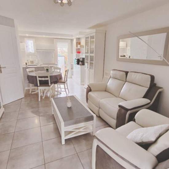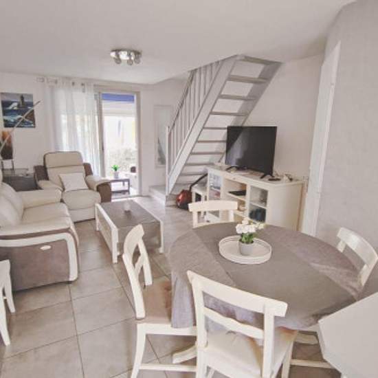 LOCATION A L'ANNEE MEUBLEE En résidence standing avec piscine et parking privé, Comprenant un salon séjour avec une cuisine attenante équipée,d'un wc au RDC . A l'étage,deux chambres avec 1lit en 140 et 1 lit en 160 avec placards , et un wc indépendant + une salle d'eau neuve avec douche Une loggia à l'entrée avec salon de jardin Belle terrasse arrière carrelée avec table et chaise de jardin Résidence le clos de la mer: position plan de ville E2( 24) Equipements : TV, frigo/congel, lave-linge, lave-vaisselle,plaque de cuisson,mobilier de jar...