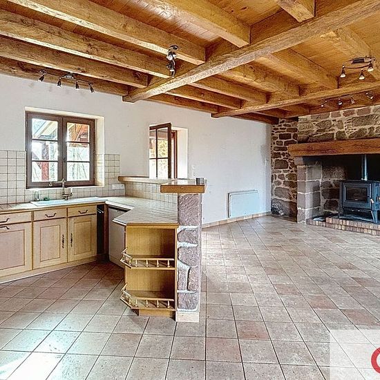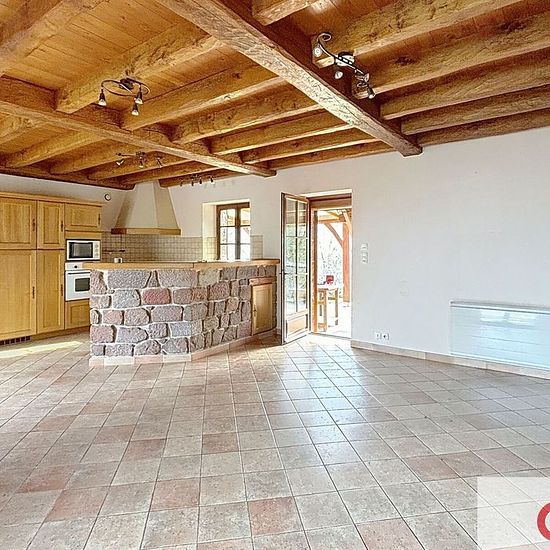 Maison À Louer. Idéalement située à la campagne, à Villac, cette charmante maison construite en 2012 est en excellent état et offre un cadre de vie paisible. Elle dispose d’un vaste séjour lumineux avec cuisine ouverte et poêle à bois, ainsi que de deux chambres agréables. L'une d'entre elles, d'une surface de plus de 20 m², comprend des placards intégrés, un cabinet de toilette et un espace pouvant faire office de bureau ou de dressing. Vous apprécierez le jardin paysager avec son puits, ainsi que la terrasse couverte, idéale pour vos mome...