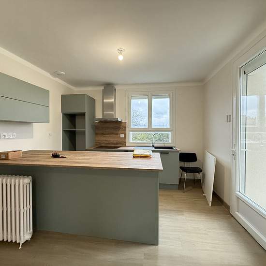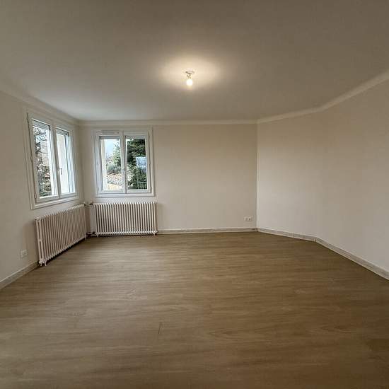 Appartement de type 4, entièrement rénové, est situé au premier étage d'une maison et se compose d'une cuisine semi-équipée ouverte sur le salon, de 3 chambres avec placard, d'une salle d'eau et de WC séparés. De plus, cet appartement possède une terrasse, un garage et un jardin d'environ 550 m².