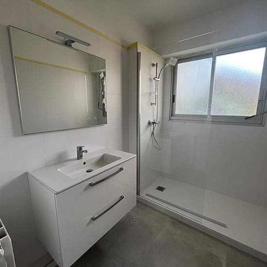 Appartement de Type 4 composé d'une entrée, une cuisine équipée (éléments hauts et bas, four, plaque, hotte), un salon/séjour, un dégagement, un wc, 3 chambres avec placards aménagés, une salle de bains avec wc, une salle d'eau, 3 terrasses et un garage en sous-sol.