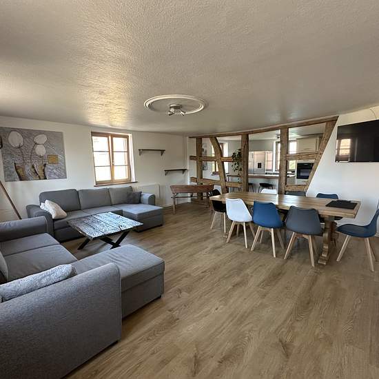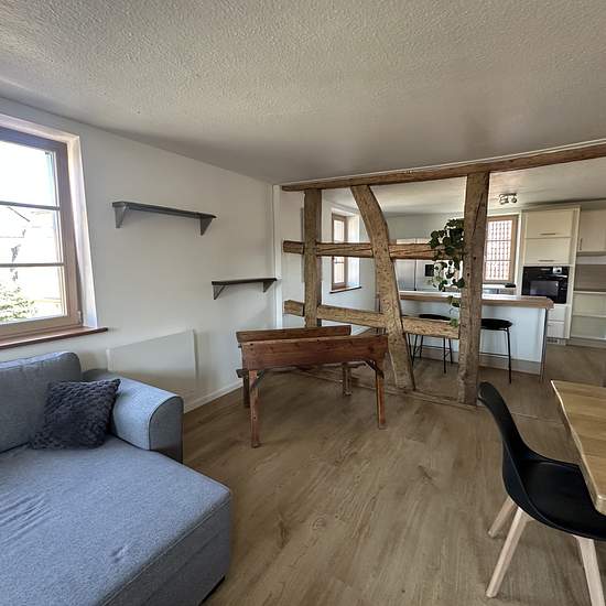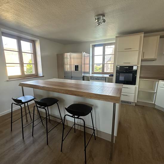 Appartement 4 pièces meublé situé à Illhaeusern, Rue du 25 Janvier, au 1er étage sans ascenseur, d'une surface habitable de 112,50m2, comprenant une entrée/dégagement, un salon/salle à manger ouverte sur une cuisine équipée, trois chambres, une salle de bain aménagée avec douche, baignoire et WC, chauffage individuel électrique et un garage. Libre à partir du 16 janvier 2026. Loyer 980,oo EUR. Pas d'avances sur charges, les locataires gèrent leurs abonnements en direct auprès des fournisseurs.