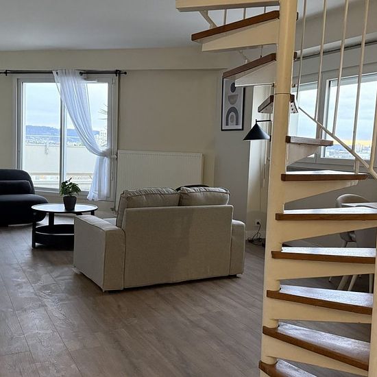 Le Petit-Quevilly, Rue Pablo Neruda. Au dixième étage avec ascenseur, un appartement meublé de 84 m² en duplex comprenant : Au premier niveau : Une entrée, un séjour salon avec accès terrasse, une cuisine équipée avec (plaques, four, hotte, machine à laver), une chambre avec salle de douche et WC indépendants. A l'étage : 2 chambres et une salle de douche. Une place de stationnement privative en sous-sol. Disponible dès maintenant. Les + : Proximité transports en communs Refait entièrement à neuf Stationnement privatif DPE B Loyer : 800 € Pr...