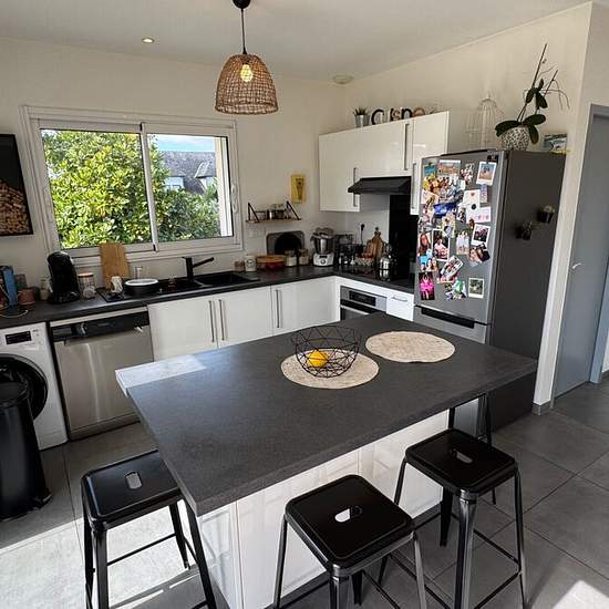 Haut de Lée / Idron, dans un quartier pavillonnaire proche des commerces et école à pieds, en impasse au calme Au Dernier étage d'un bâtiment R+1 récent, avec Vaste Terrasse face aux Pyrénées plein Sud Appartement à l'esprit Loft avec splendides volumes, 110.80 m² habitables, charpente apparente, grandes ouvertures sur une terrasse expo sud avec vue imprenable Belle entrée avec grands placards, immense pièce de vie avec poutres apparentes et plafonds cathédrale, cuisine ouverte avec îlot central (semi équipée : plaque induction + hotte aspir...