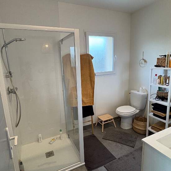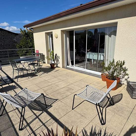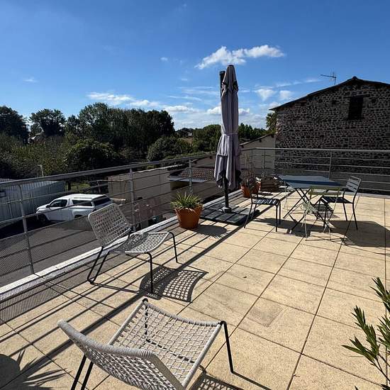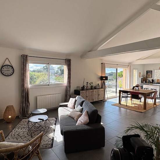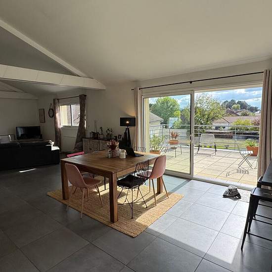 Haut de Lée / Idron, dans un quartier pavillonnaire proche des commerces et école à pieds, en impasse au calme Au Dernier étage d'un bâtiment R+1 récent, avec Vaste Terrasse face aux Pyrénées plein Sud Appartement à l'esprit Loft avec splendides volumes, 110.80 m² habitables, charpente apparente, grandes ouvertures sur une terrasse expo sud avec vue imprenable Belle entrée avec grands placards, immense pièce de vie avec poutres apparentes et plafonds cathédrale, cuisine ouverte avec îlot central (semi équipée : plaque induction + hotte aspir...