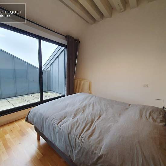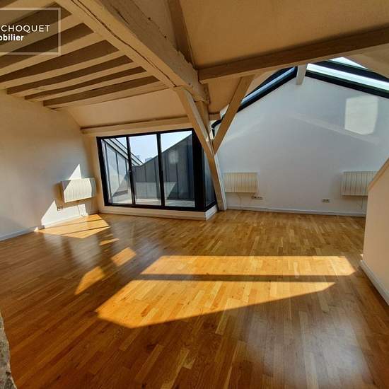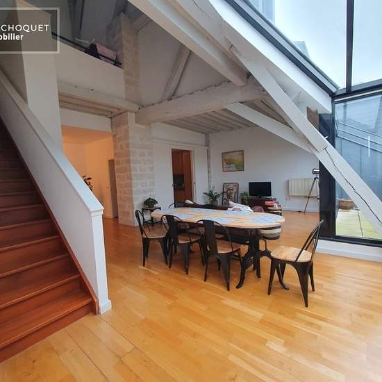 Dans un monument historique réhabilité (rénovation de grand standing), un appartement F4 en triplex de 146 m² + 8 m² utiles. Hall d'entrée parqueté avec placard-penderie - Vaste séjour cathédrale parqueté de 36 m² avec accès loggia - Cuisine carrelée séparée (par portes coulissantes) entièrement équipée et meublée (plaque vitrocéramique, four, hotte, grand réfrigérateur, lave-vaisselle, plans de travail, évier double bac, rangements hauts et bas) - Dégagement parqueté vers partie nuit avec placard - Suite parentale : Chambre de 12,50 m² avec...