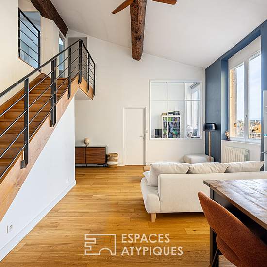 Profitant d'une magnifique vue sur la Saône, ce beau duplex familial prend place au dernier étage d'un immeuble ancien situé sur le quai Pierre Scize. Le niveau principal propose une somptueuse pièce de vie lumineuse avec une magnifique vue. Le parquet massif, les poutres et le bel escalier central contribuent largement à l'ambiance chaleureuse de l'appartement. Une circulation intéressante autour de l'escalier permet d'accéder à la cuisine et son cellier par deux entrées distinctes. Ce niveau est complété par une chambre avec sa salle de ba...