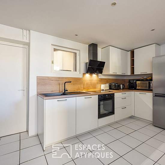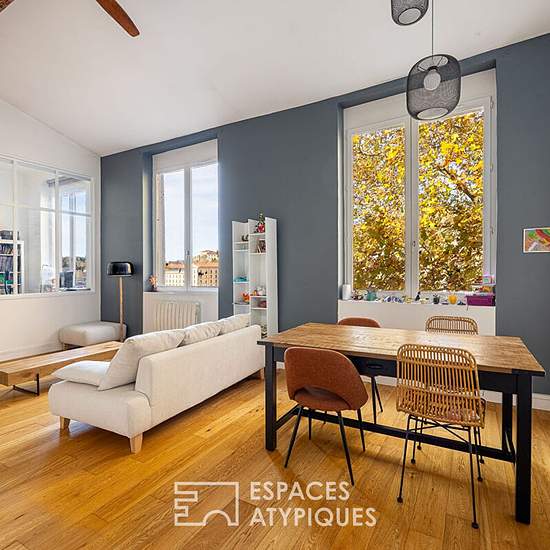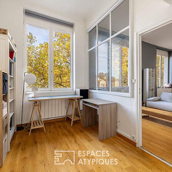 Profitant d'une magnifique vue sur la Saône, ce beau duplex familial prend place au dernier étage d'un immeuble ancien situé sur le quai Pierre Scize. Le niveau principal propose une somptueuse pièce de vie lumineuse avec une magnifique vue. Le parquet massif, les poutres et le bel escalier central contribuent largement à l'ambiance chaleureuse de l'appartement. Une circulation intéressante autour de l'escalier permet d'accéder à la cuisine et son cellier par deux entrées distinctes. Ce niveau est complété par une chambre avec sa salle de ba...