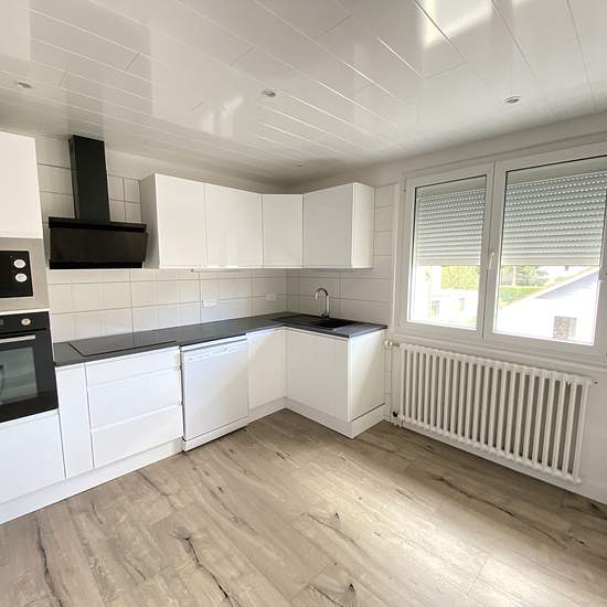 A louer a MANDEURE, dans un secteur prisé et au calme, APPARTEMENT T4 de 84 m2 avec entrée individuelle, comprenant : une entrée, une magnifique cuisine équipée neuve, une beau salon/séjour, 3 chambres, une salle d'eau avec douche italienne, un wc séparé. Une très grande terrasse sans vis-à-vis, cellier et une cave complètent cet appartement Le chauffage est au gaz. Une isolation a été faite par l'extérieur. L'appartement est entièrement rénové à neuf (fenêtres, volets électriques, isolation, cuisine, salle de bain...) RARE SUR LE MARCHE