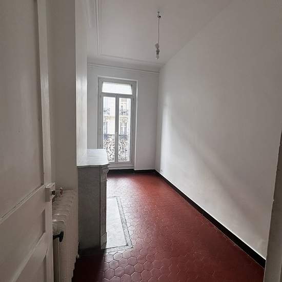 Appartement traversant dans immeuble ancien au 2 ème étage composé d'une vaste entrée desservant coté rue un très grand séjour très clair, 3 fenêtres et cheminée décorative + 1 dressing et d'une chambre . Côté cour à l'arrière, d'une grande chambre parentale , d'une chambre enfant les 2 avec balcon ,d'une cuisine semi-équipée d'une plaque de cuisson et d'un four, d'une salle de bains avec baignoire, d'un wc séparé, de dégagements avec 4 placards et d'un wc séparé. 1 pièce noire située dans l'entrée pouvant servir de bureau