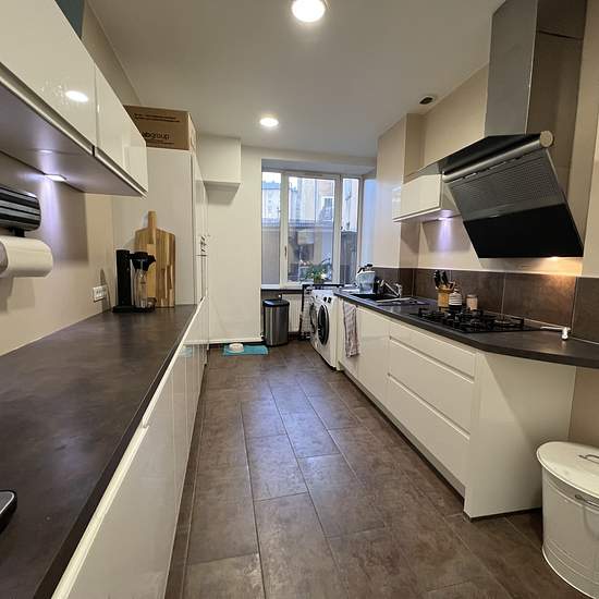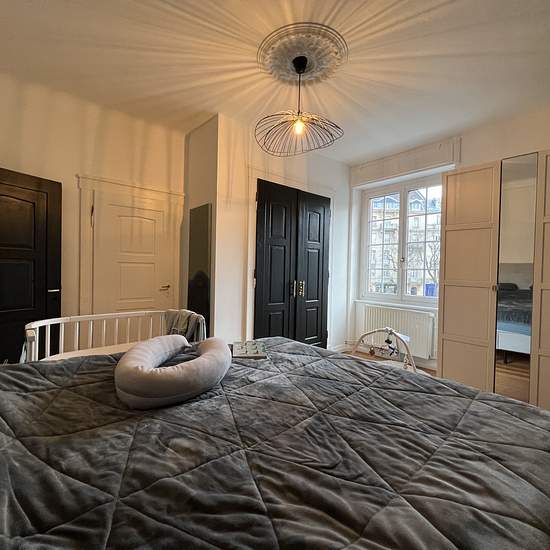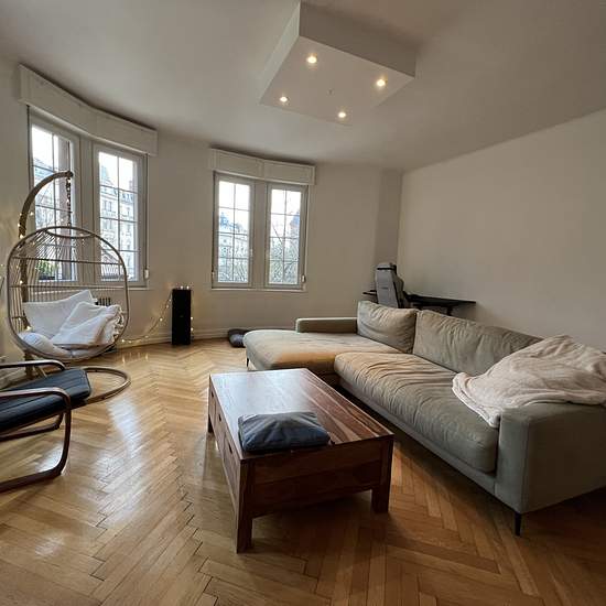 RARE! A deux pas de la Gare, dans un petit immeuble avec ascenseur au 1er étage, bel appartement de type 4 pièces développant une surface de 107m2, composé d'une grande entrée, un spacieux salon-séjour, une cuisine intégralement équipée, deux lumineuses chambres avec dressing, salle de douche moderne et w-c séparé. Au sous-sol une cave. Disponible 07/04/2026. . A SAISIR!