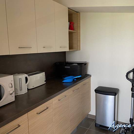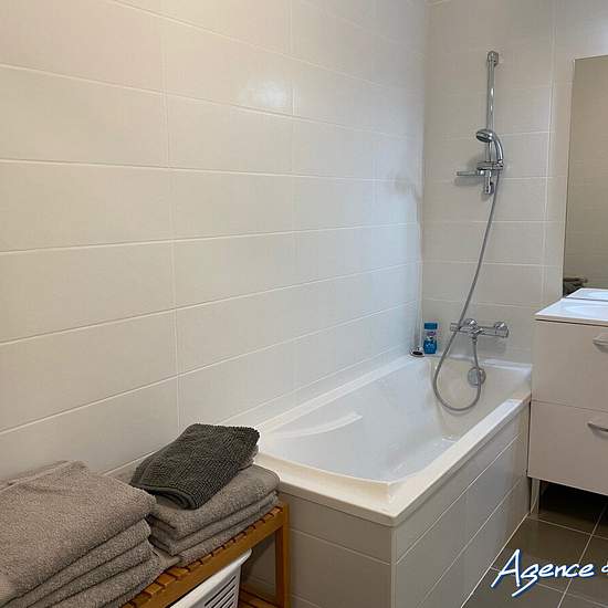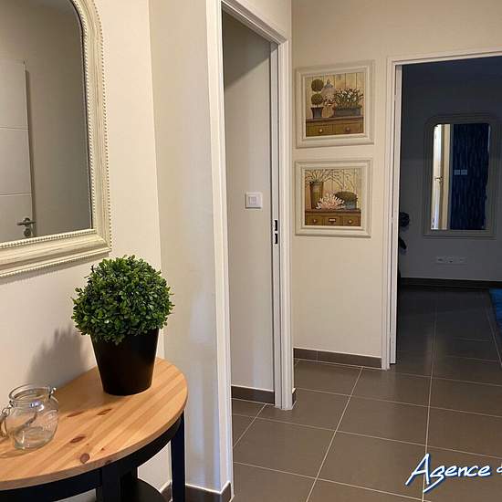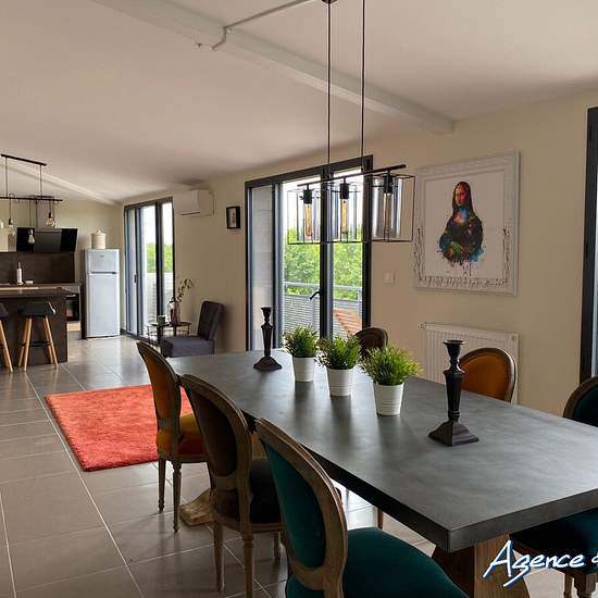 Niché au cinquième et dernier étage d'une résidence récente, sur le quai Vallière en centre ville de Narbonne, retrouvez cet appartement T4 de standing de 150m2 totalement meublé, équipé et climatisé. Vous y trouverez trois belles chambres décorées avec goût. Deux d’entre elles se partagent une grande salle de bain avec une baignoire et une douche. La suite parentale dispose de sa propre salle de bain privée et de son dressing. Un grand séjour /salle à manger donnant sur une belle terrasse avec vue sur le canal et une cuisine aménagée et équ...