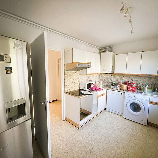 Nîmes, quartier de la Gazelle. Dans une résidence calme, arborée et sécurisée, appartement T4 climatisé de 86,14 m² situé au 1er étage avec ascenseur, comprenant : un hall d'entrée, 2 chambres, un séjour/salon (3ème chambre possible) avec terrasse, une cuisine indépendante équipée (hotte, machine à laver, lave vaisselle, et réfrigérateur/congélateur), une loggia, une buanderie, une salle d'eau et un wc séparé. Une place de parking extérieur. Disponible de suite. Loyer 820€ cc (communs, OM, entretien chaudière et clim). honoraires 720€ dont 2...