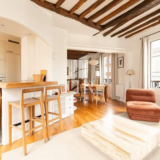 EXCLUSIVITÉ - 75003 Paris Rue de Turenne - Metro Filles du Calvaire ( L8 ) En plein coeur du Marais, à proximité immédiate de la rue de Bretagne, et aux 2e et 3e étage par ascenseur d'un bel immeuble d'angle, CHR Immobilier Consulting vous invite à découvrir en Exclusivité ce bel appartement 4 pièces en Duplex de 110m2 ! Il se compose au premier niveau d'un beau séjour salle à manger avec poutres apparentes et triple exposition, une cuisine américaine équipée ainsi qu'un coin bureau, une salle de douche et un WC. Au second niveau, vous décou...