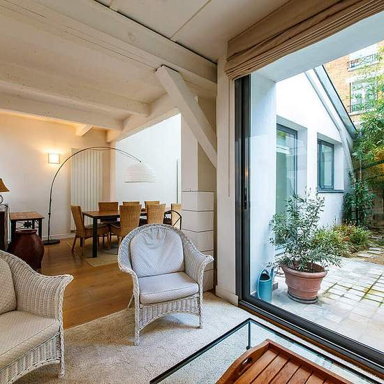 Spacious bright duplex apartment for long-term rent in the 5th district of Paris. It's a charming comfortable flat in a private house with a small garden at Rue Broca – an excellent family accommodation in a good area of the city. Surface - 173 square meters; stylish attractive interior; wonderful furnishings; number of tenants - 7 persons; open terrace. Minimum rental period - 10 months. The apartment has a living room, a dining room, four bedrooms, an equipped kitchen, an improvised study (on the top level), three bathrooms, three toile...