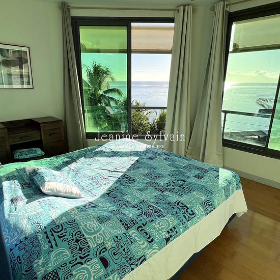 Vue mer et Moorea imprenable, bel F4 de 93 m2 habitables de très bon standing, très lumineux proche commerces et écoles, meublé et équipé, 2 chambres climatisées, 1 bureau, 2 salles d'eau, séjour, cuisine, terrasse couverte de 24 m2. 1 place de parking, et grand cellier. Résidence sécurisée avec gardien, piscine et fare pote'e.