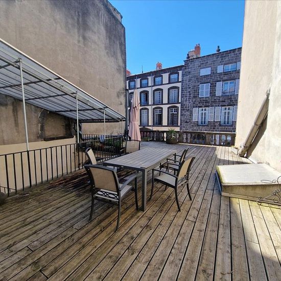 Mon toit en Auvergne vous propose ce bel appartement T4 de 105m² accompagné de sa terrasse de 80m². Le logement dispose de deux entrées, une rue de l'Horloge et une rue Soubrany. L'appartement est composé d'une salle de séjour avec une cuisine attenante indépendante disposant d'un espace de stockage/buanderie à l'arrière. Un grand dégagement avec rangements désservant 3 belles chambres dont une avec penderie (volets électriques dans toutes les chambres). Un WC indépendant. Une salle de douche avec un WC. Une autre salle de bain avec baignoir...