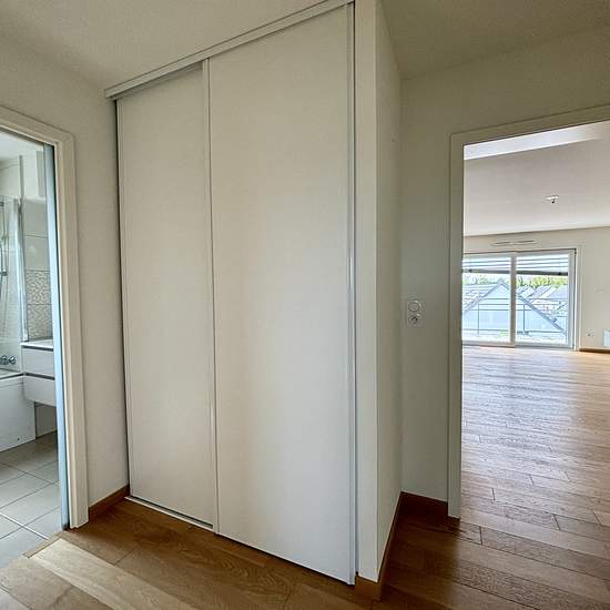 Situé dans une résidence de standing à Rosenau, F4 de 90m2 comprenant : Une entrée avec placard mural, une cuisine équipée ouverte sur un séjour lumineux avec accès au balcon. Trois chambres à coucher, chacune avec un placard mural intégré, une salle de bains et un WC séparé. Chauffage individuel au gaz. Deux places de parking à l'extérieur de la résidence, une cave et un grand garage avec borne de recharge pour voiture électrique complètent la location de cet appartement. Disponible à partir du 15 octobre. Les informations sur les risques a...
