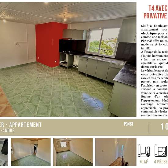 1085€ hors charges Situé à Cambuston, Saint-André, cette appartement vous offre un portail électrique pour entrer dans votre cour comme une maison, ce T4 entièrement rénové offre un cadre de vie confortable, moderne et fonctionnel, idéal pour une famille. À l’étage de la résidence, le grand séjour, s’ouvre harmonieusement sur la cuisine, créant un espace de vie chaleureux et agréable au quotidien. Le balcon, lui, donne sur la rue. Le véritable atout de ce bien réside dans sa cour privative de 47 m², un avantage rare et très recherché. Cet es...