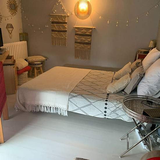 Appartement Duplex Residence bord de mer, au rez de chaussée une pièce de vie avec coin cuisine aménagée et équipée (frigidaire-congélateur, plaques de cuisson à induction, micro-onde, lave-vaisselle, four, télévision) et son espace repas, un coin salon avec canapé et télévision, un WC séparé, une salle de bains, un cellier avec lave-linge, sèche linge et petits électroménagers, une chambre avec un placard, deux lits simples 90 et une télévision. A l'étage, un dégagement avec placard avec penderie, une chambre avec placard, deux lits simples...
