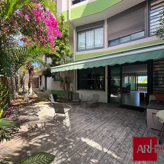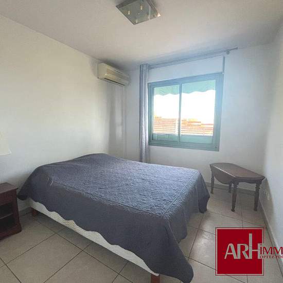 SAINT GILLES LES BAINS - Mont Roquefeuil - Résidence LE TRISKELL, avenue du Capricorne Bel appartement en RDC de type F3/F4 meublé longue durée en résidence principale, d'une superficie habitable de 107 m² comprenant: une entrée, un grand séjour traversant avec brasseur d'air et climatisation, avec en prolongement une chambre d'appoint climatisée fermée par une baie vitrée, une cuisine complètement équipée et aménagée, deux belles chambres climatisées avec placards (18 et 12 m2), une large salle d'eau avec douche à l'italienne et double vasq...