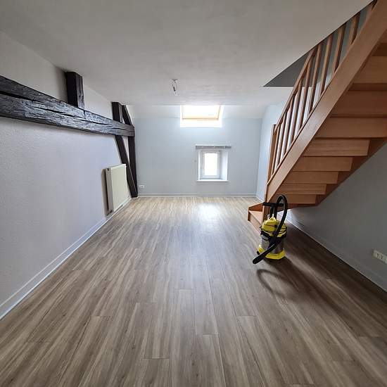 Au centre de Vagney, bel F4 en duplex accessible depuis une cour intérieure. Composé d'une cuisine équipée ouverte sur séjour, de 2 chambres, d'un bureau, d'une salle de bains et de 2 WC. Parking et cave. Chauffage gaz de ville.