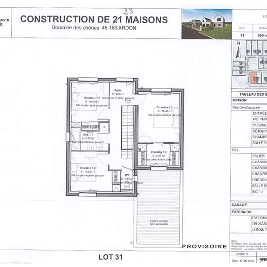 ARDON, proche bourg dans nouveau lotissement beau pavillon F5 comprenant : au RDC : une entrée avec placard, un séjour avec cuisine aménagée et équipée (hotte + plaques), un wc, une suite parentale avec dressing et salle d'eau. A l'étage : un palier, une salle de bains, un wc, 3 chambres avec dressing. Un garage, une place de parking extérieure, un jardin clos de 493m² et une terrasse de 17m².